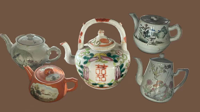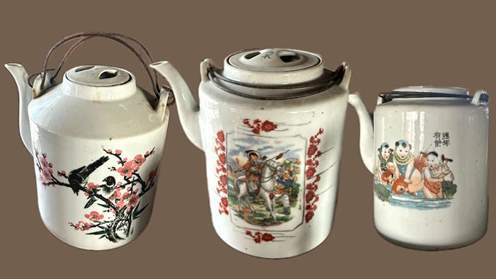 家中藏壶以民清瓷壶为最,大小形制各异:大者尺余,昔年用于泡制凉茶;小者盈握,当属文人雅士案头清供。壶身绘事尤为精妙,或山水空蒙,或福禄寿喜,或英雄豪杰,一笔一画间,尽是匠人心思,更见岁月留痕。