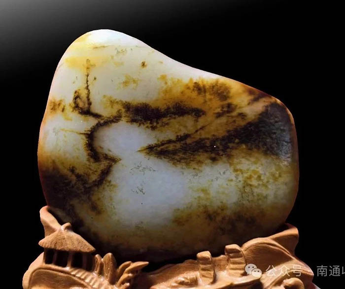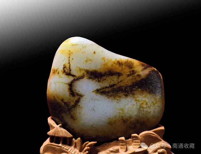 我喜爱的一块新玉是一个籽料原石。十多年前,我在朋友宴请之余,无聊时在一藏友发的朋友圈中看中这块玉的。这不仅是和田籽料,同时也是画面玉。玉面天然和田风光,玉龙河晨光普照,岸边胡杨枯黄。一幅中国画,一幅天然的中国画!玉是和田料,画是和田风光。好玉随缘,我收下上天所赐,爱不释手。