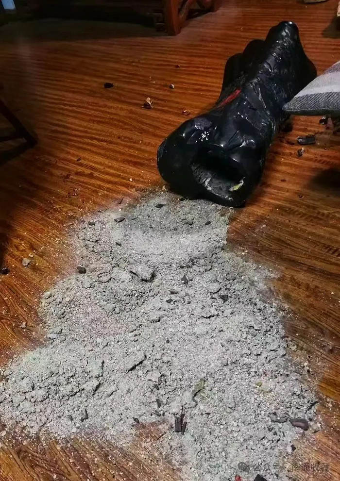 次日,好友电话告诉我,木头是小叶紫檀,油性好,只是外皮做了旧。俗话说“十檀九空”,做旧的人用水泥浆塞满空洞,清理的水泥足有十四斤多。原来不是大师看不懂,是份量不对,搅乱了大师的判断。这个劈开的小叶紫檀,我请好友以大化小,制作了多件精美的艺术品。