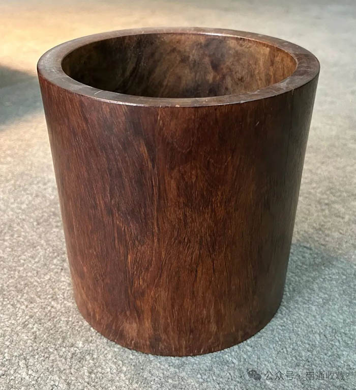 笔海是文房用具中的一种,笔海之名取其口径很大之意。这笔海回来后,好多人不认同。一不是老货,二不是紫檀。本地曲塘有一个资深的古董商强烈表示,这不是小叶紫檀,是非州紫檀。这小子识宝水平还是有的。我的老师刘化北曾经说过,此人水平不在他之下,但是心术不正。其实,老师说得不错,他们都是唯利是图,而且同行间一定是互相踩踏。这木料是不是真正的小叶紫檀,我也是一头雾水。